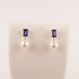 6x4mm emerald cut tanzanite are set in 14k yellow gold. 7mm cultured akoya pearls dangle below the tanzanite.