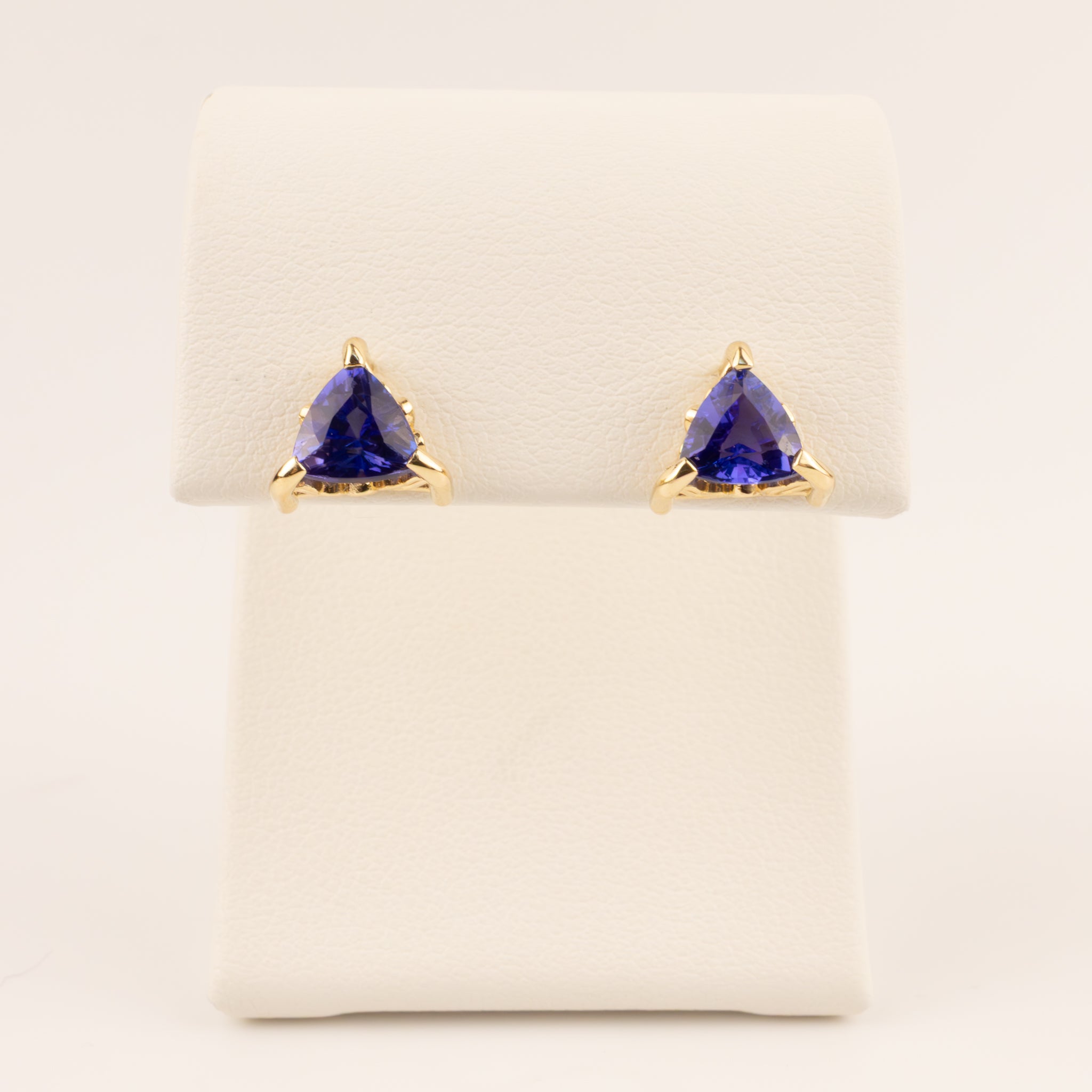 6.5mm trillion tanzanites are 3-prong set in 14k yellow gold. There are approx. 1.7 total carats of tanzanite. The earrings feature filigree baskets