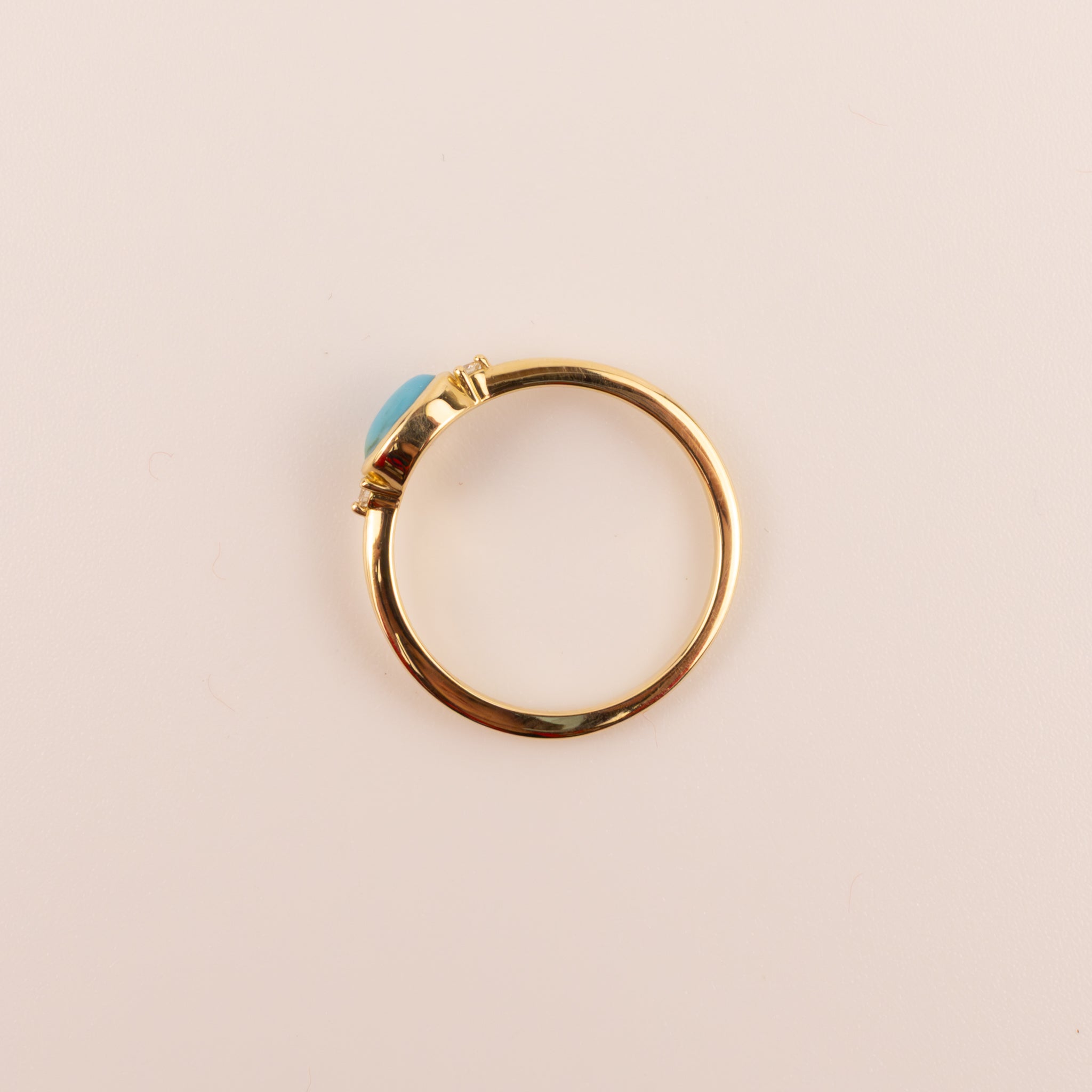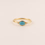 One 6x4mm oval cabochon turquoise is bezel set in 14k yellow gold. A round diamond is set on either side of the turquoise.