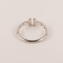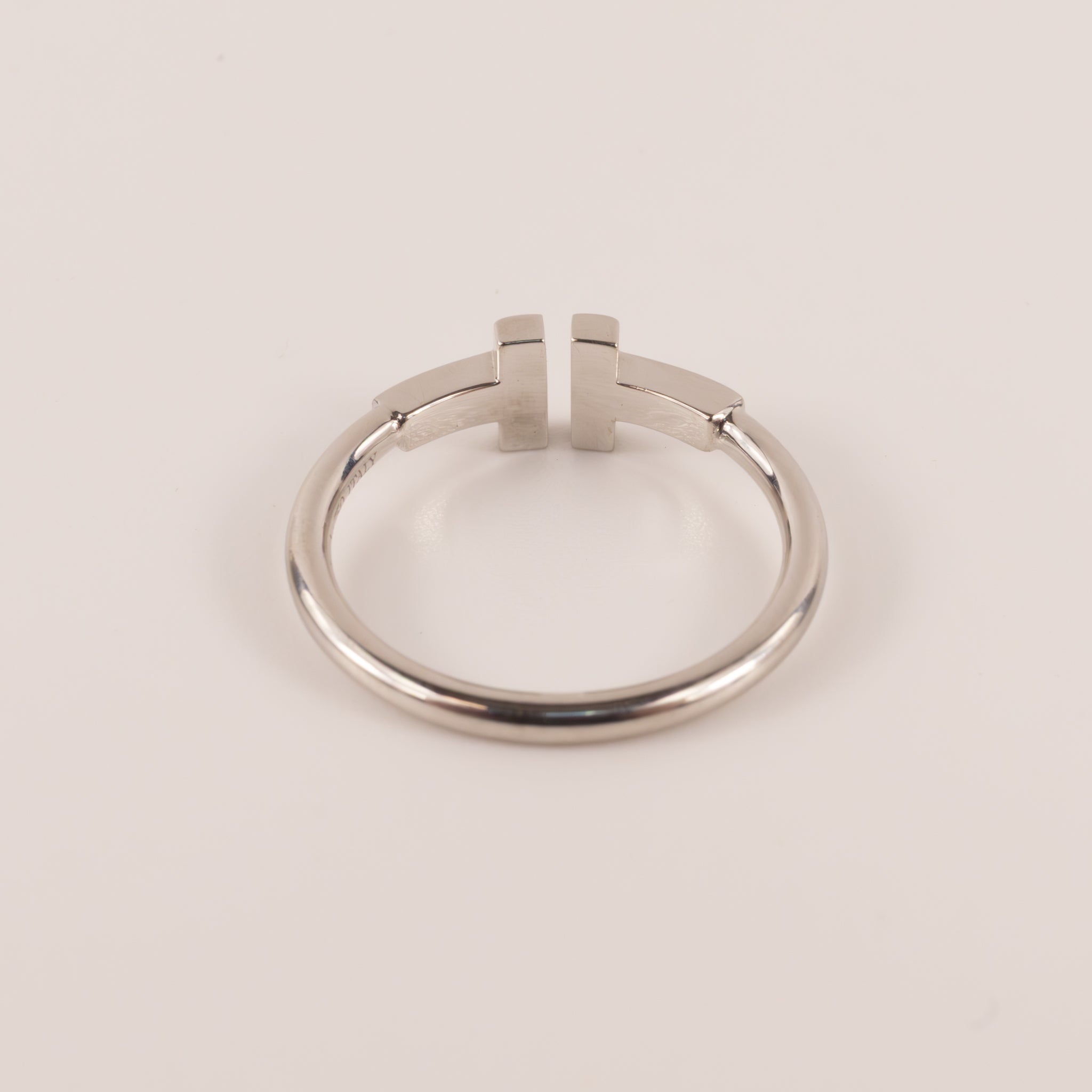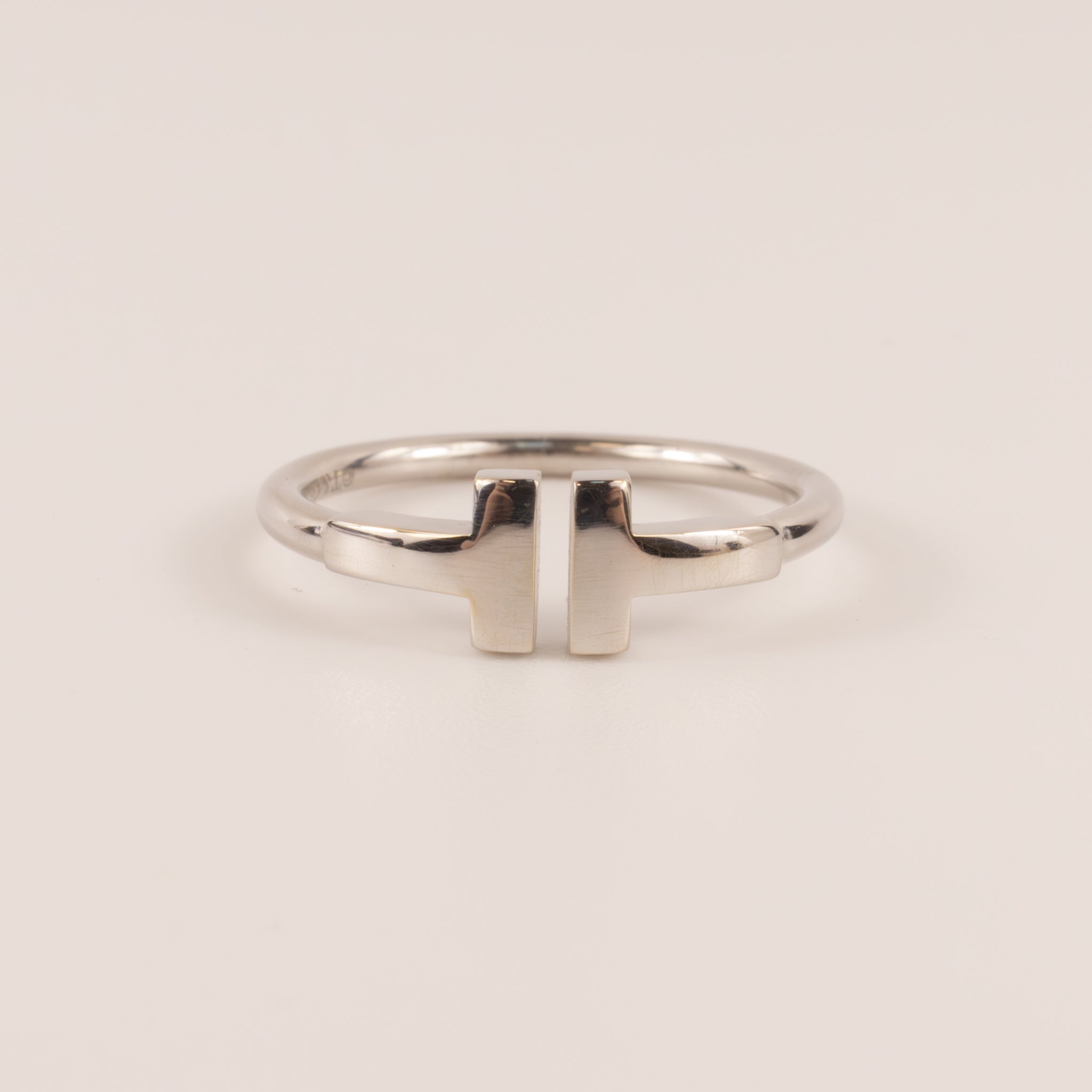 Tiffany & Co. ring is made of 18k white gold. Two "T"s are set across from each other with negative space in between.