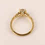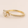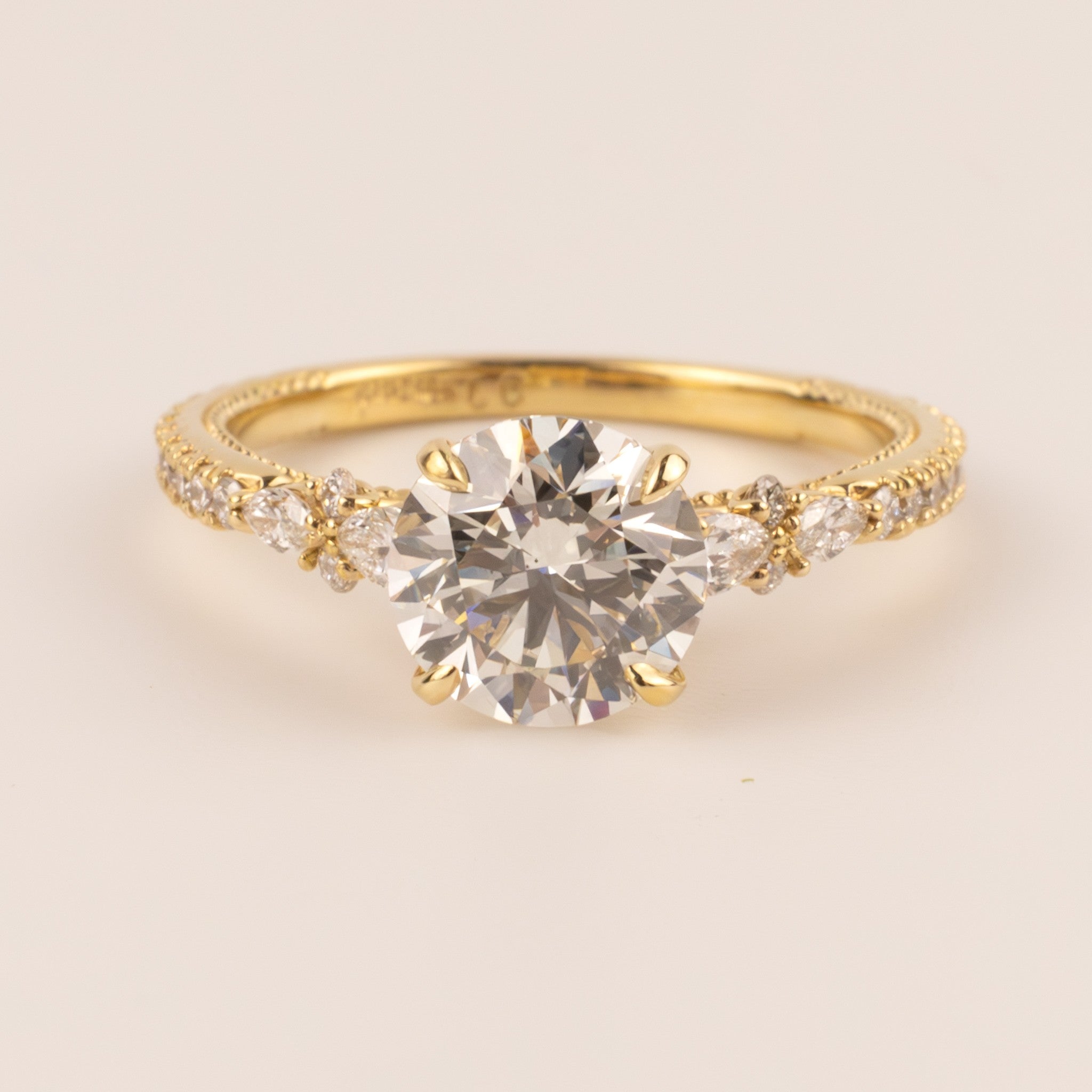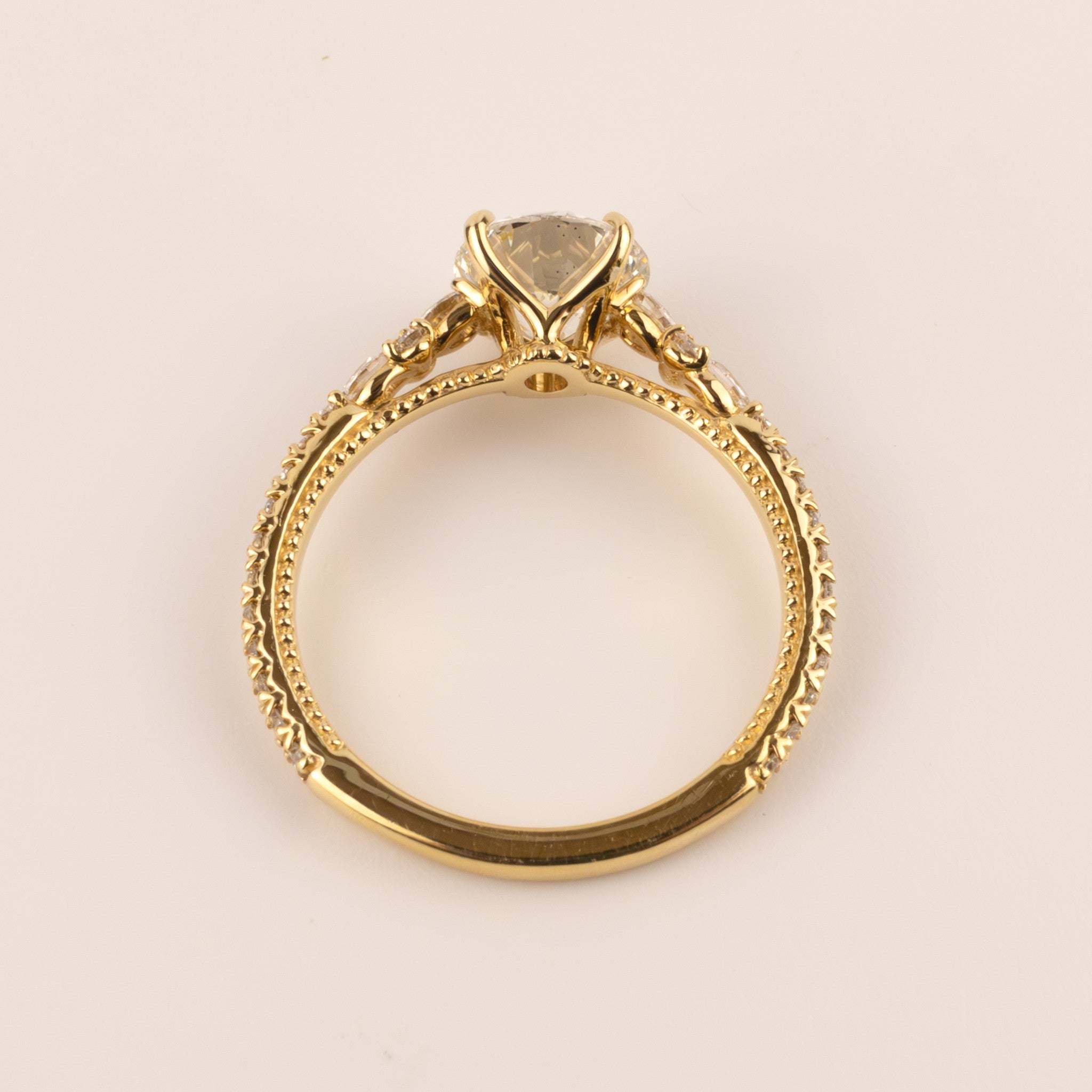 7.3mm round lab grown diamond is set in 18k yellow gold. Round, pear, and marquise cut lab grown diamonds are set along the shank. There are 0.50 total carat weight of accent diamonds. The ring features a cathedral mounting with bead detailing.