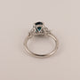 One oval blue tourmaline is prong set in platinum. The blue tourmaline is 2.40 carats. The tourmaline has four marquise diamonds on either side in the shape of flowers or butterflies. The ring also features diamonds around the girdle, also known as a hidden halo. There is 0.49 total carat weight of diamond.