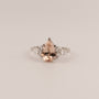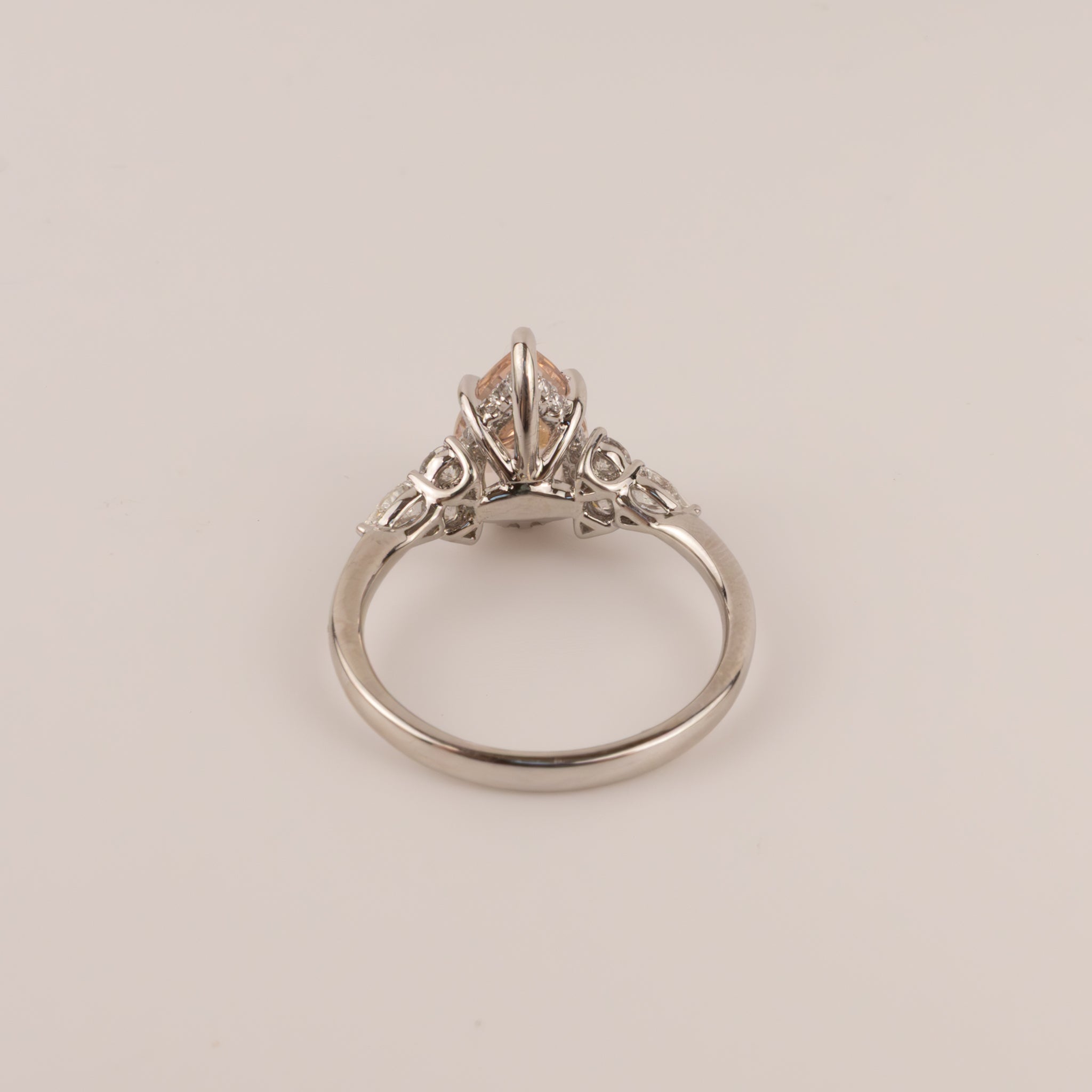 Pear shaped morganite is prong set in platinum. There is 1.80 carats of morganite. Round and pear diamonds are set on either side of the morganite. The ring features a hidden halo of diamonds around the girdle. There are 0.57 total carat weight of diamonds.