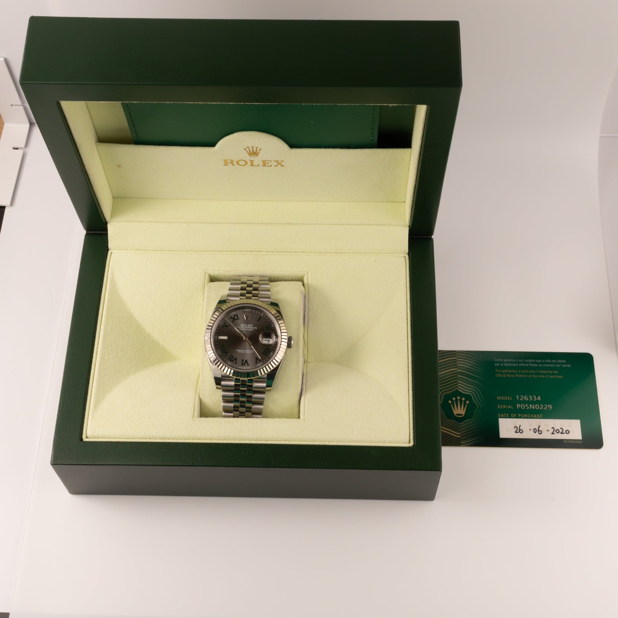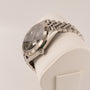 This men's Rolex features an automatic movement. The stainless steel 41mm case has an 18k white gold fluted bezel. The grey tone face has green roman numeral hour markers. The bracelet is a stainless steel Jubilee style. This watch is also referred to as the "Wimbledon".