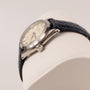 The Rolex features a manual wind movement. The watch features a stainless steel 31mm case. An aftermarket genuine leather band has been added to the watch.