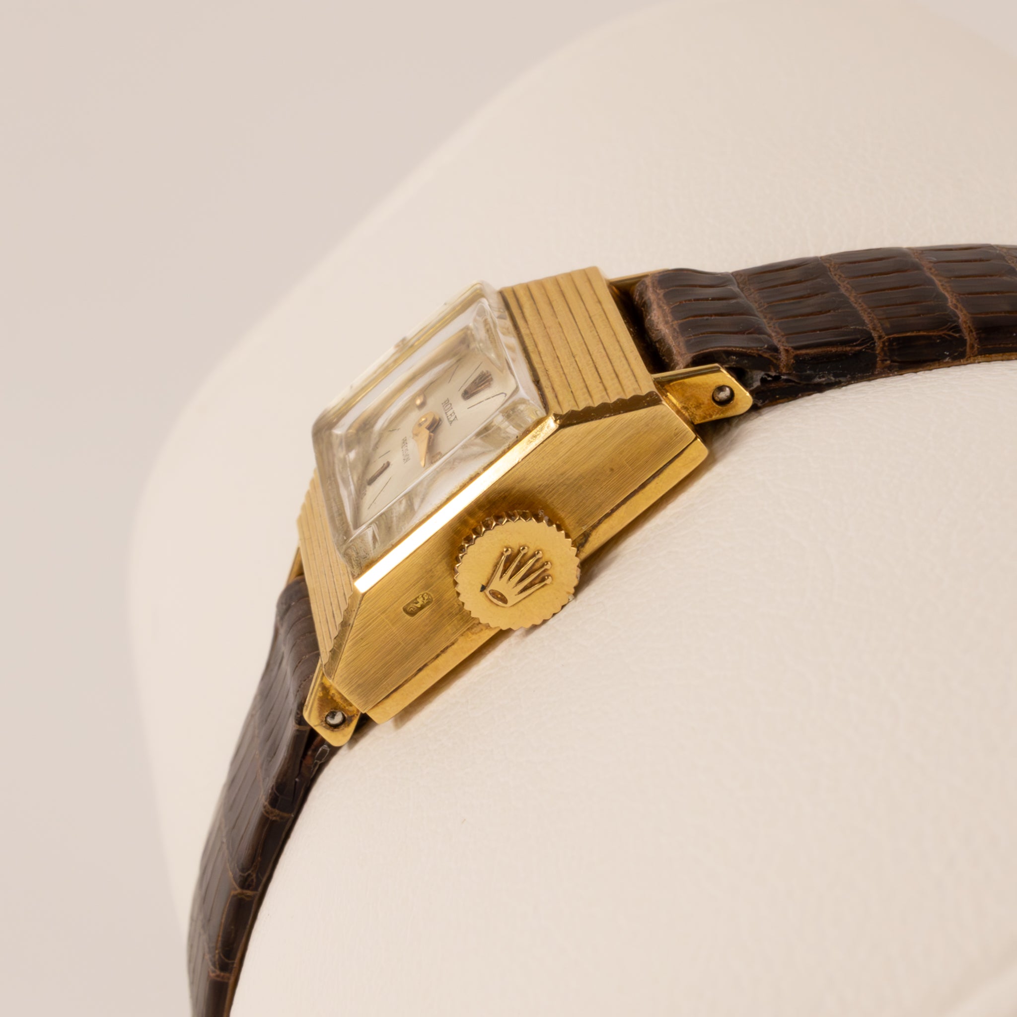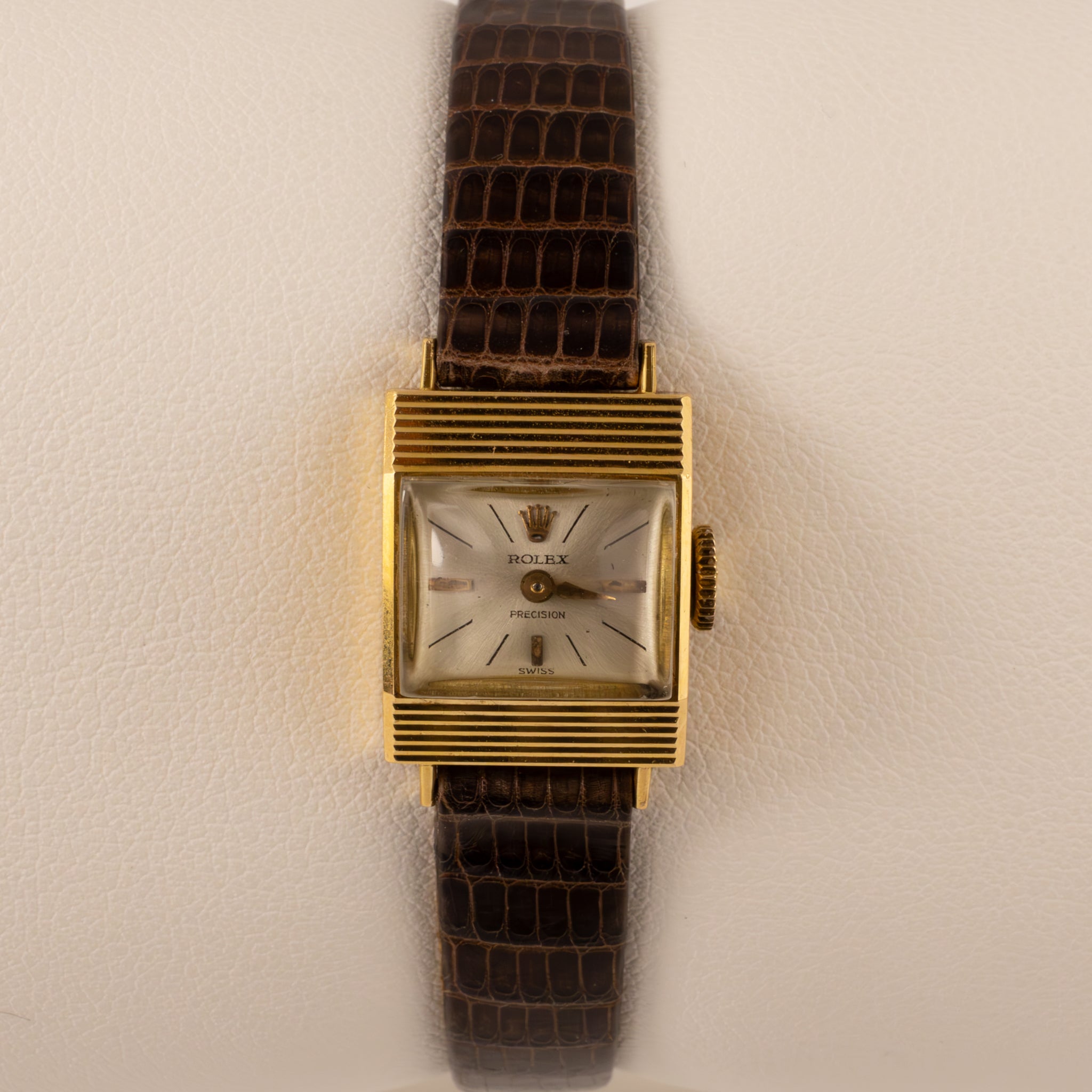 This Ladies Precision Rolex features a manual winding movement The18k yellow gold case measure 13.5mm wide. The watch features an aftermarket leather watch band with original Rolex buckle.