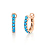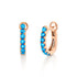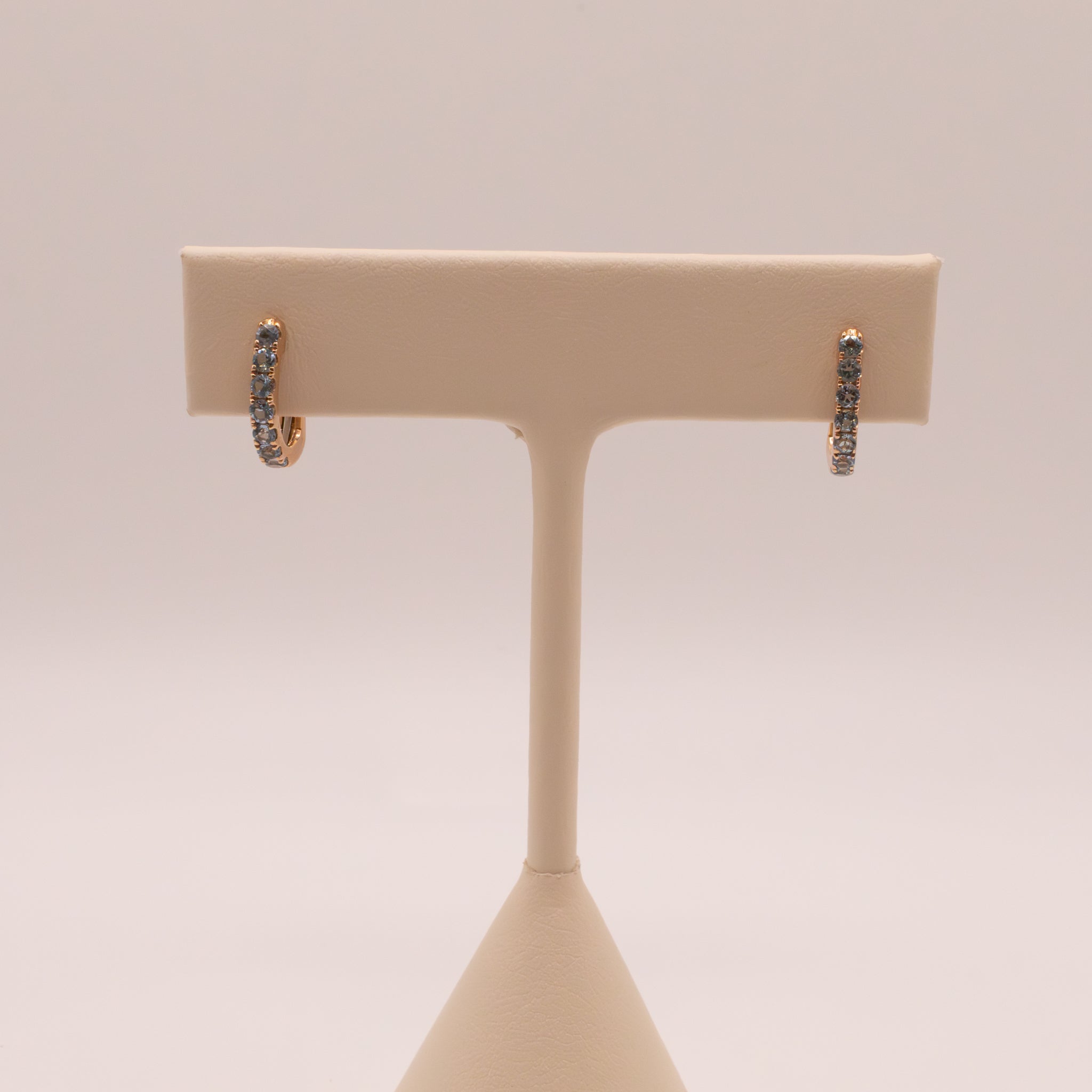 2mm round sky blue topaz stones are set in 14k rose gold. There are 0.68 total carat weight of sky blue topaz. The earrings feature hinged omega back closures.