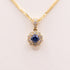 A round 3.5mm blue sapphire is set in a 14k yellow gold diamond accented pendant. The diamond flower halo and bail contain 0.10 total carat weight of diamonds. The pendant features milgrain accents.