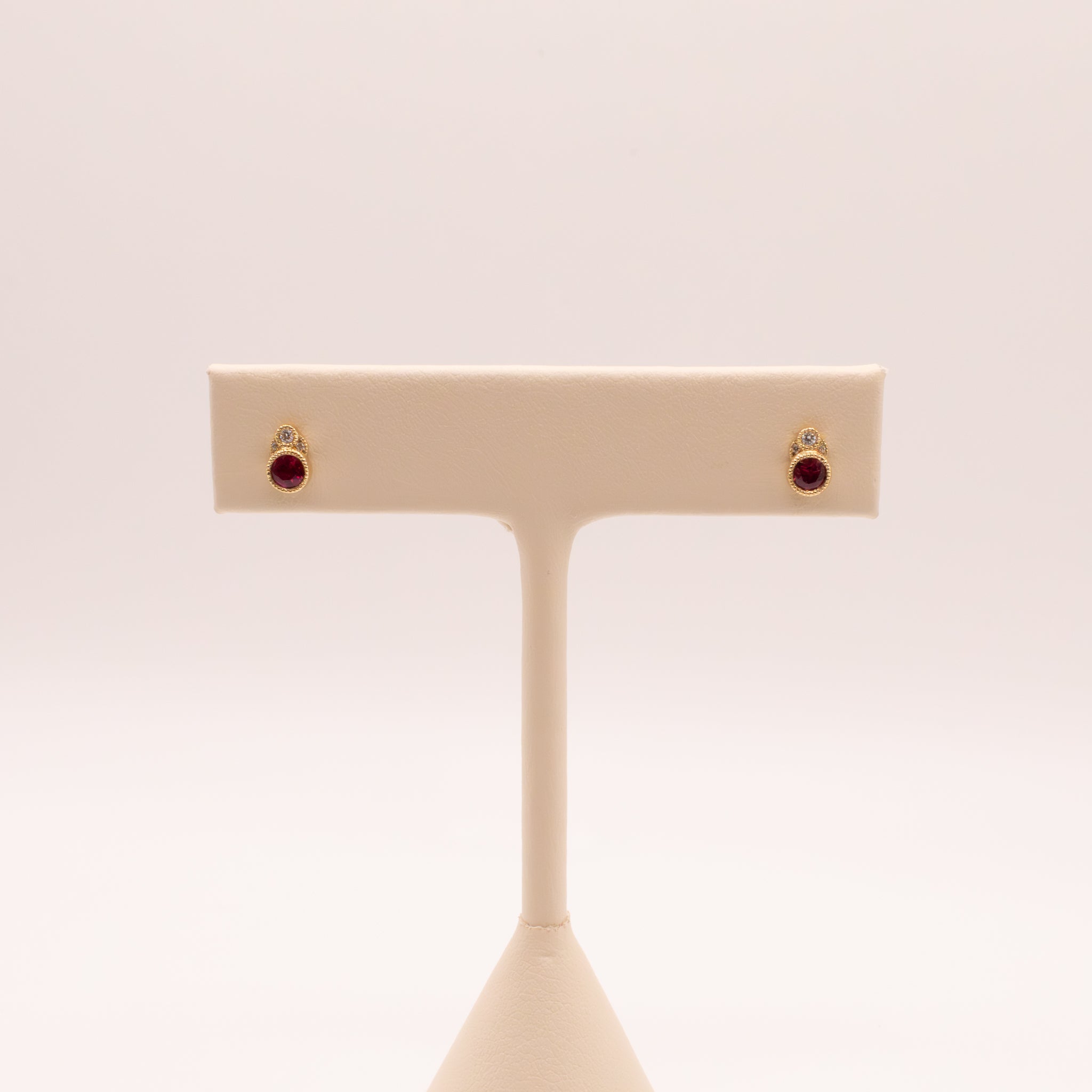 Round 3.5mm rubies are bezel set in milgrain accented 14k yellow gold. The cluster accent diamonds have a total carat weight of 0.06.