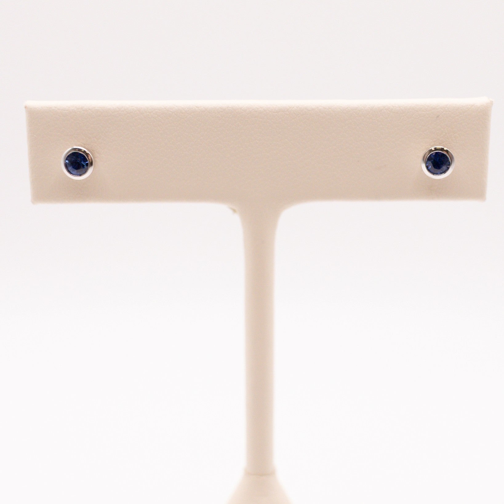 Round 3.5mm blue sapphires are bezel set in 14k white gold. There are 0.52 total carat weight of sapphires.