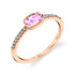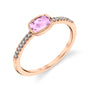 This cushion cut lavender amethyst is east-west set in a 14k rose gold diamond accented mounting. There is 0.55 total carat weight of lavender amethyst. There are 0.11 total carat weight of diamonds.