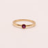 This 3mm ruby ring is bezel set in a solitaire 14k yellow gold mounting. The ruby has a total carat weight of 0.16.