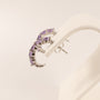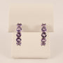 4mm round amethyst are set in sterling silver. There are 5 stones set in each earring. The hoops are on posts in an open j-shape.