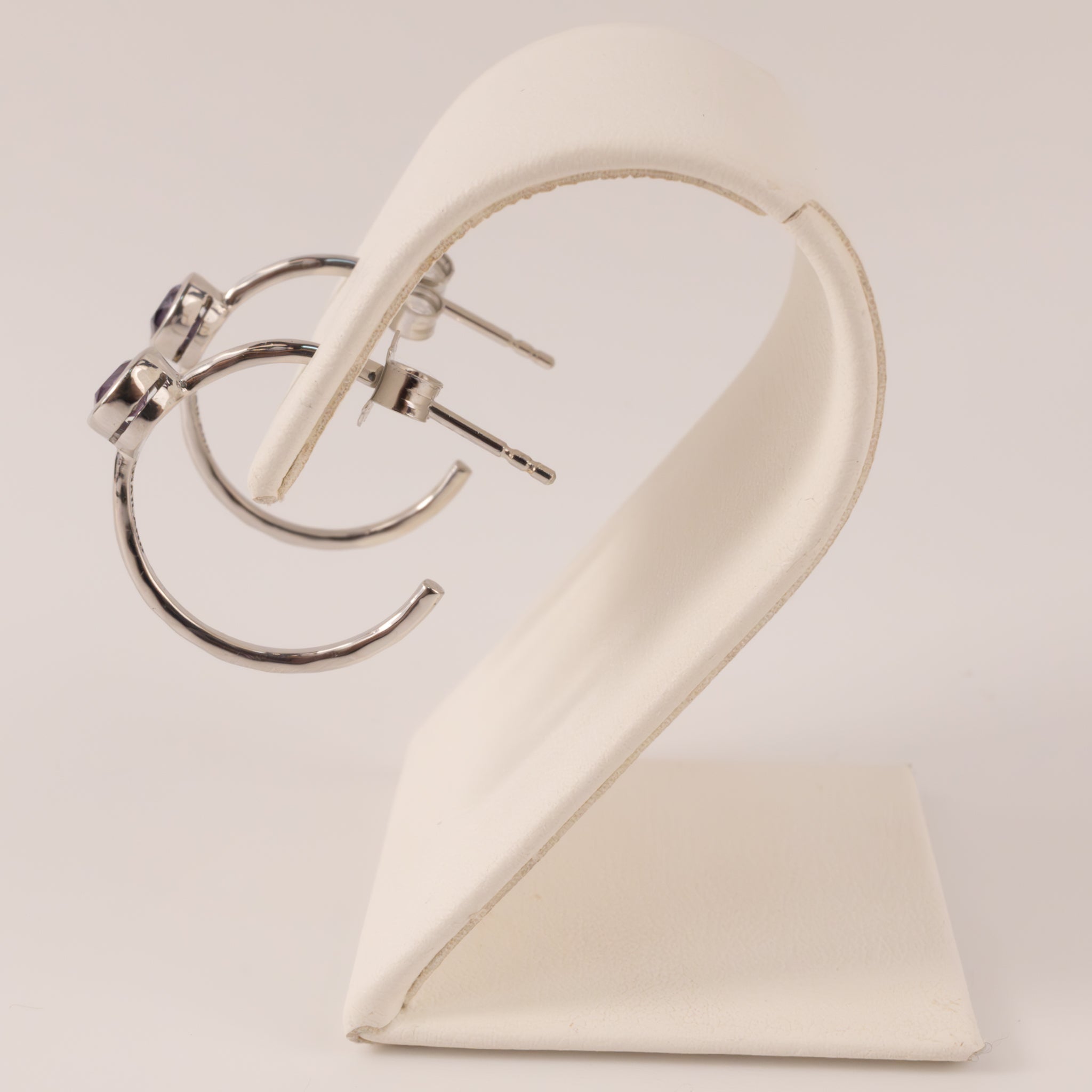 4mm amethysts are bezel set in sterling silver. The earrings are 19mm in length. The hoops are on posts.