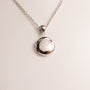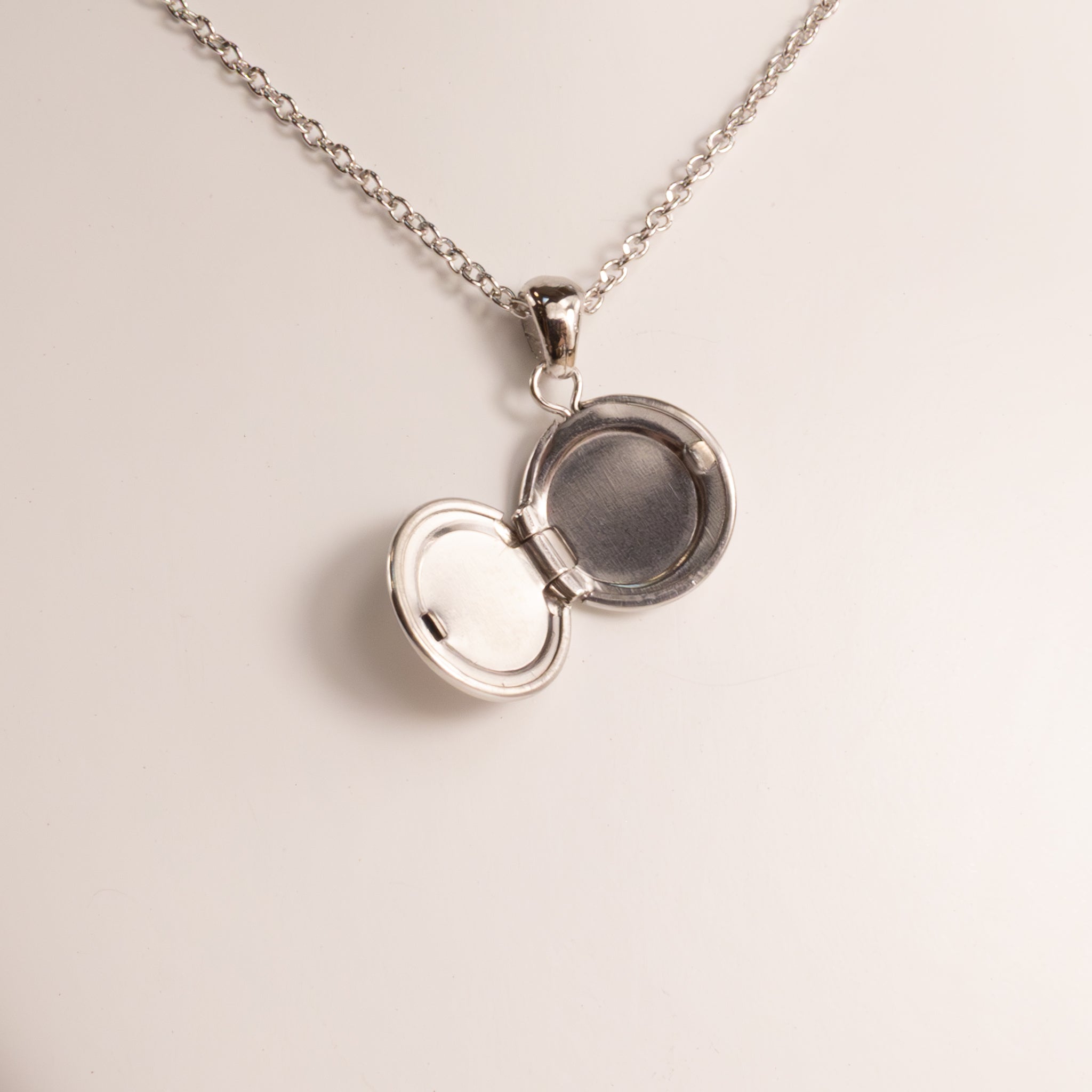 One 10mm round locket is made of sterling silver. The pendant measures 16mm from the bail. The locket is on a 0.7mm 14-15" cable chain. The chain features a lobster clasp.