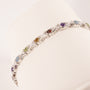 3mm round Swiss blue topaz, citrine, amethyst, peridot, and garnet are set in sterling silver. The bracelet is in a cross-stitch style that features a box catch closure. The bracelet measures 7.25".