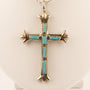 Rectangular turquoise are set in sterling silver. The cross pendant measures 2" x 1.5".