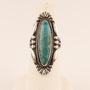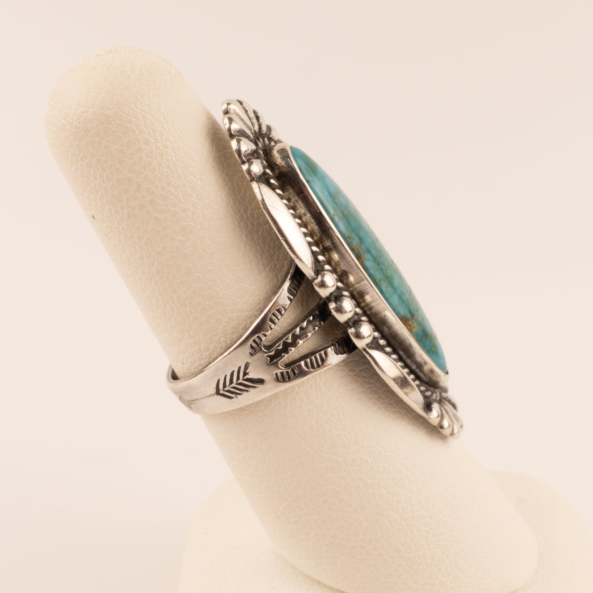26.4mm oblong turquoise stone is bezel set in sterling silver. The ring features rope and beaded details. Arrows are engraved on either side of the ring's shank.