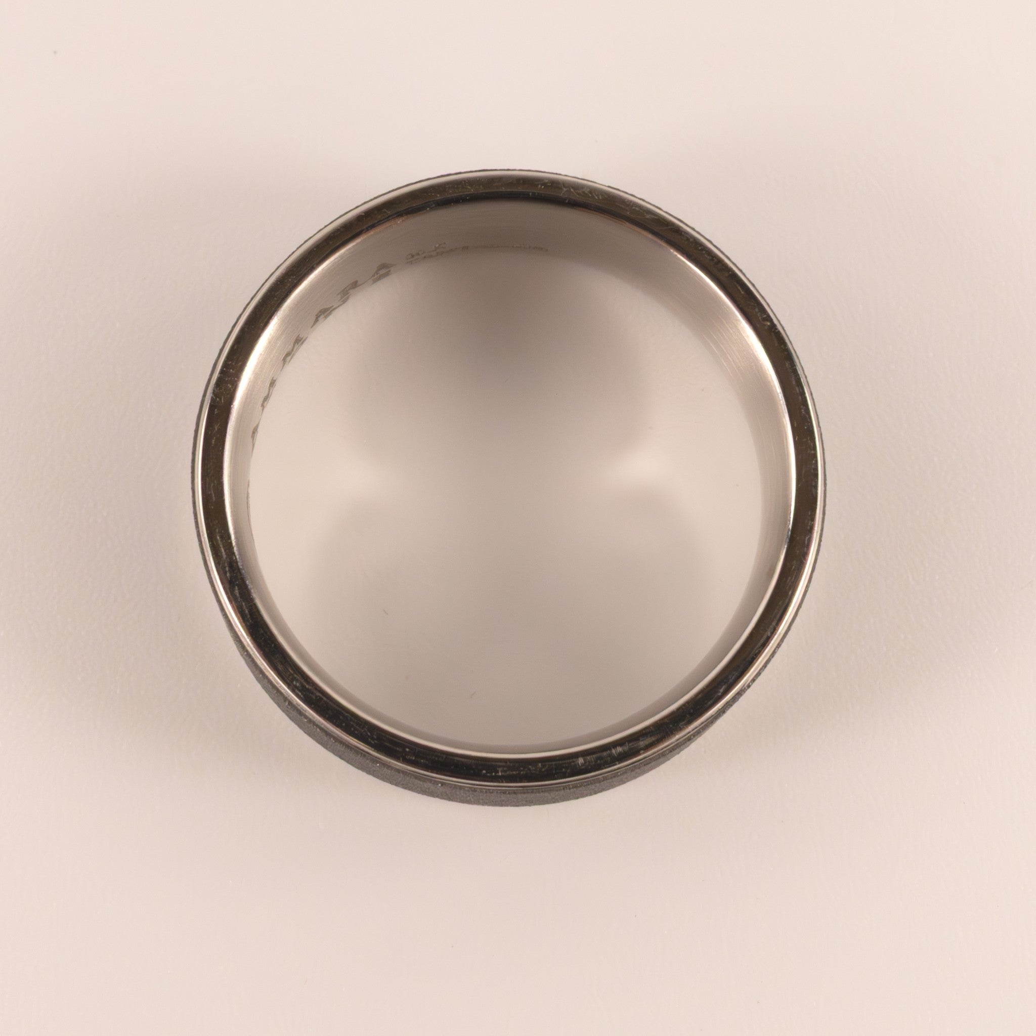 Mens 7.5mm ring is made of 14k white gold and tantalum. The tantalum features a wire brush finish that goes all the way around the ring.